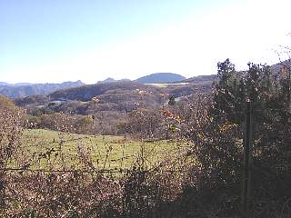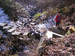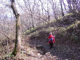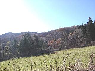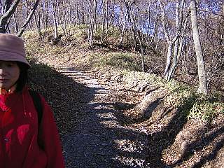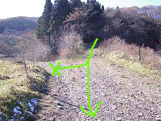 その8 もともとは道が整備されていたようですが、コンクリートの階段が壊れていたり、溝に落ち葉が溜まっていたり、下のほうでは道の半分くらいが雨でなかったり歩きにくいところがあります。 牧草地を過ぎると分かれ道です。道に赤い矢印があったので直進。右側に牛舎が見えてきました。 プラプラゆっくり歩いたので1時間かかりました。