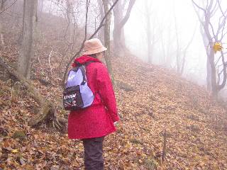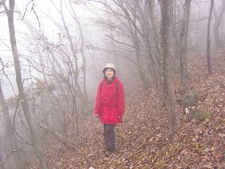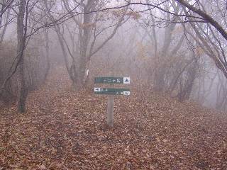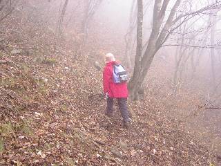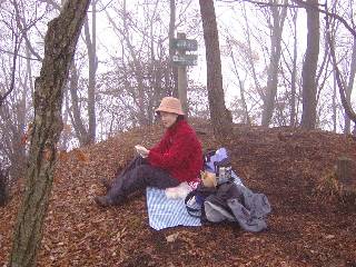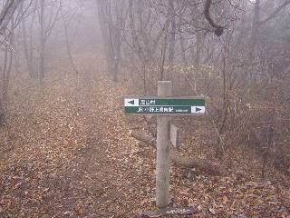 その5 下りてからわかりましたが、男坂を下ったんです。 私たちのような初心者は下りは「女坂」、上りが「男坂」の方がいいようです。 少し行くとメインの南東コースとの分岐点です。十二ケ岳から30分ちょっとで中ノ岳の頂上です。 ここで早い昼食です。休むと寒く感じます。 小野子山から来た奥様ふたり組と私たちは、お互い先に行っても景色が見えないことを確認してここでUターンです。