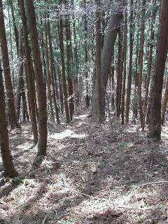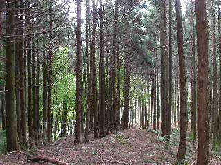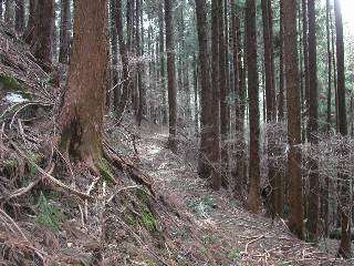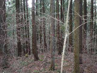 その5 下山して行くと杉林?ヒノキ林?似たような景色なので、とにかく赤テープを探して歩きます。目が良くてよかった。