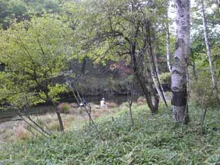 | 湯滝が遠くに見えるポイントだそうです。よそ見をして木道から落っこちました。痛い! | この辺は絵を描く人たちが多いです。 |