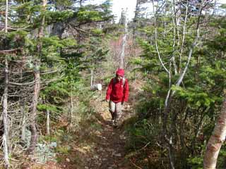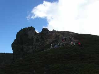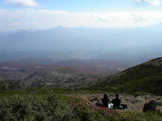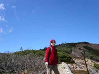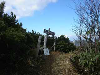 林を少し先に行くと標識があります。ん?万座温泉方面と書いてありますが山頂とは書いていません。もう少し先に行くと万座が見えます。実はガス発生地帯のため山頂へ行く道へ行かないようにロープが張ってあった、ということでした。だからさっきの場所が「歩道最高地点」だったんですね。最高地点へ戻るとき何人にも聞かれました。どのガイドブックでも山頂に行けるように書いてあるんですね。