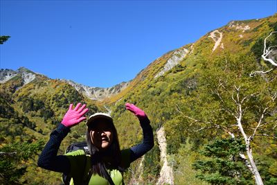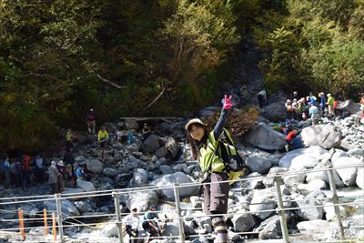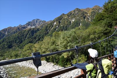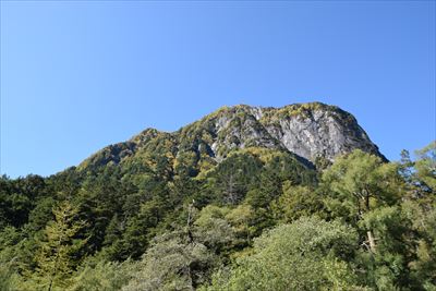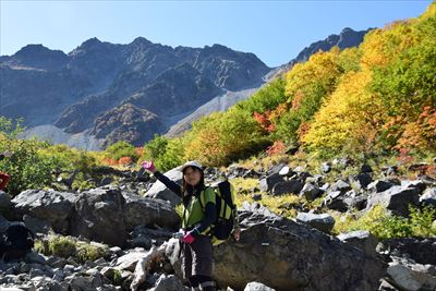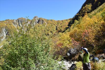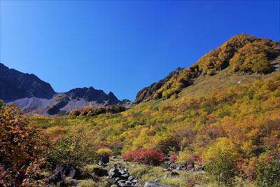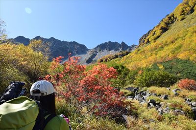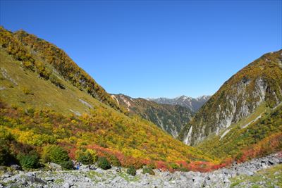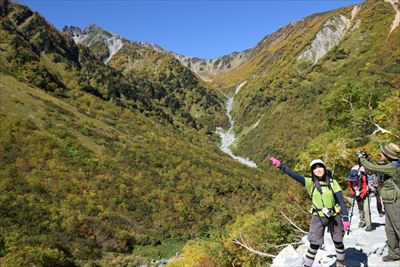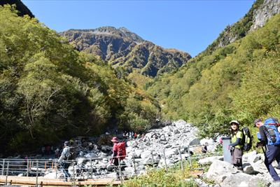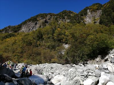 | 本谷橋の河原で休憩。 この先の登りは渋滞気味。下りの方が団体と勘違いするほどつながってしまいました。 紅葉ゾーンに突入。(向こうに見えるのは横尾尾根?) |