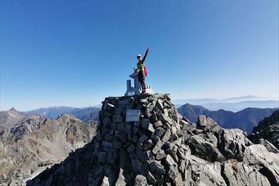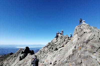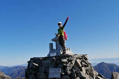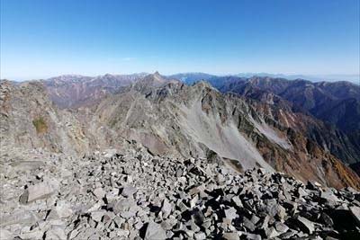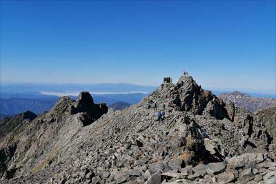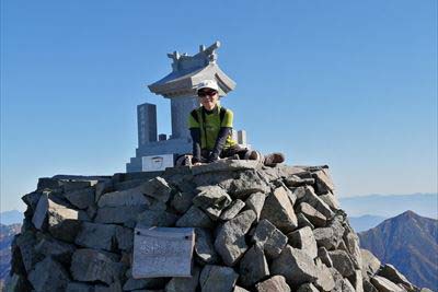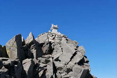 | 奥穂高岳は日本で3番目に高い山?(積み上げてある部分は標高に入らないらしい。三角点はどこ?) 穂高連峰の最高峰なので、あっさり百名山の「穂高岳」に登頂となりました。(ハイトスさんのおKさんの最終百名山。) |