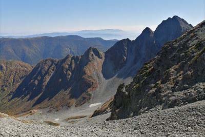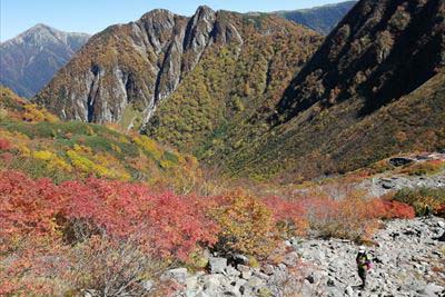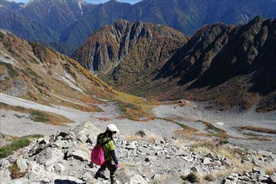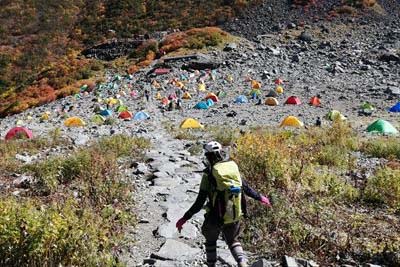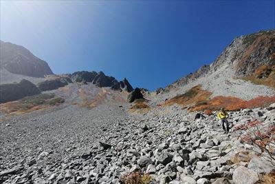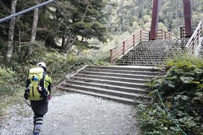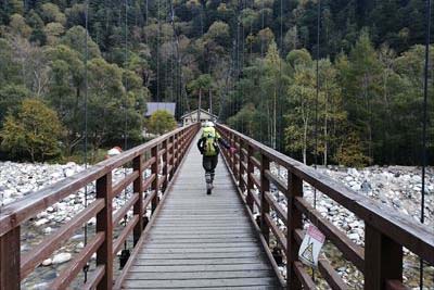 | 横尾まで写真も撮らなかった?お腹と頭が痛いので、ひたすら歩き。 さすがに疲れて足も痛い。本谷橋の手前で高崎の女性とお話ししたり。(テント泊やめて同室になった。) 3時過ぎに登ってくる人がいます。横尾は2時通過と書いてあるので中国系の方? |