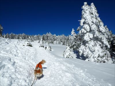 | 奥さんが往復1時間かからずに戻ってきました。さすがだ! さくらは雪の上でお昼寝を始めたところでした。 |