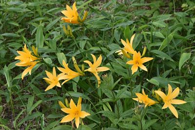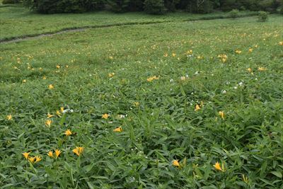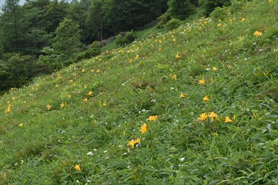 | 見頃は1週間後以降、と予想したけど 斜面が一面の黄色になるかはその年によるからなぁ たまに晴れて青空が見えるけど 暑くなるので晴れない方がいいかも |