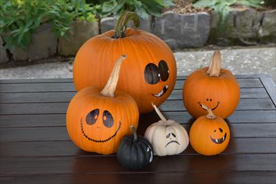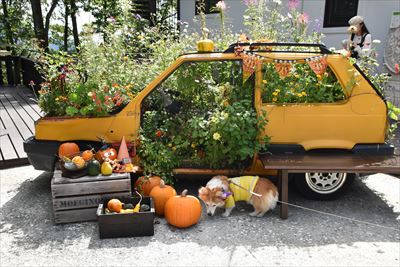 | フィアットパンダ?廃車に花、ここにもかぼちゃ ベンチで抱っこ休憩 |