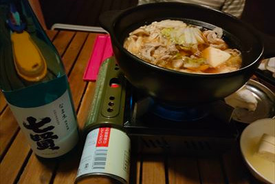 | WEBに載ってた薪ストーブ、こたつはなかったけど AC電源と電気ストーブ、充電式ランタン、テーブル&椅子があるので必要なのは寝袋だけ (BBQグリルがあったのは誤算、残った炭持ってくるんだった?) なんと井戸水を沸かしたお風呂が!うちだけの貸し切りなのに沸かしてくれてうれしい 夕食はランチにあきらめたジンギスカン、鶏の山賊焼き。そしてお鍋 お酒はビール、ワイン、地元の日本酒「七賢」の生酒♪ |