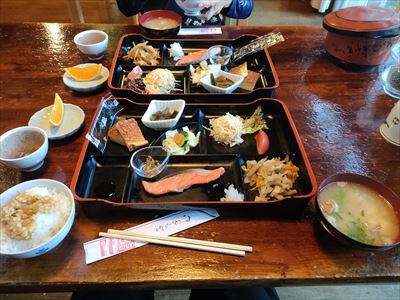 | 6/28(金):朝 もう1組も登山なので朝食を早目にしていただきました、なんと同じ群馬のお夫婦(YAMAPのサンライズさん) |