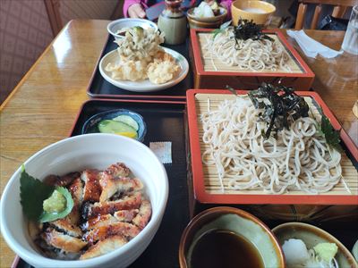 | 紫陽花 ⇒ ランチ ⇒ 日帰り温泉の予定でしたが雨が止まないので順番変更 まずは美の山公園の麓、秩父のお食事処「和銅」で蕎麦ランチ 奥さんは舞茸天付のくるみ汁蕎麦、僕はわさび鰻丼付のざるそば |