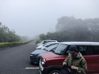 | 美の山公園への道は裏側だからなのか細いくねくね道でした 第1駐車場に到着、こんな天候でも結構車がいます まずは蓑山山頂へ |
