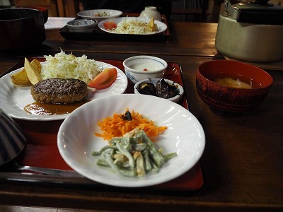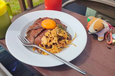 | 4時間もかけて見晴に到着 尾瀬小屋でランチ、僕のステーキ丼より奥さんのフレンチトーストの方が凄い!! (前回食べたハンバーガーとかいろいろなくなり新メニューに変更、単品ステーキはグレードアップした別物) |