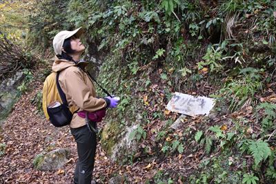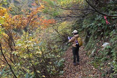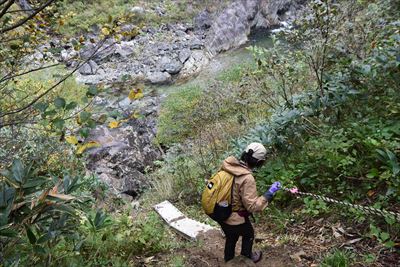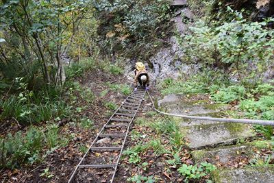 僕は滝前、奥さんは後方へ ※行き来するのは厳しいのではしごの上まで戻ります