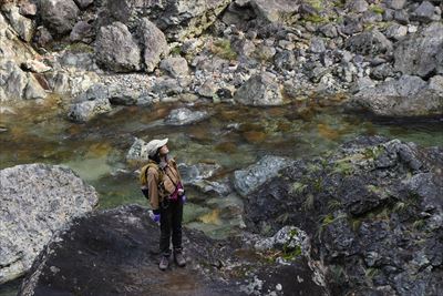 休憩後に奥さんが滝前へ、そろそろ人がやってきました