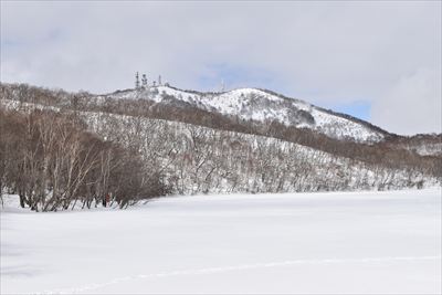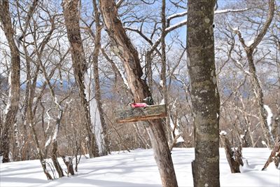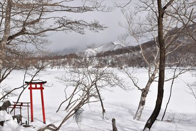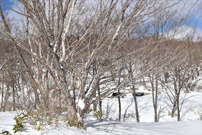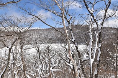 | 水門のベンチで準備をして湖畔の道へ、皆さん湖上を歩くので湖畔はトレースなし 少し進んでみたけど雪が深いのでスノーシューに履き替え、左の斜面を朝香嶺へ向かいます |