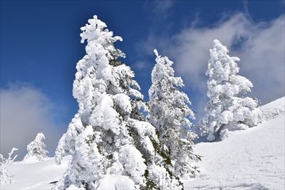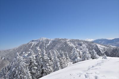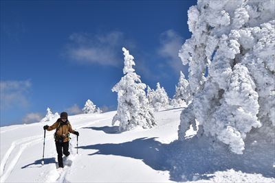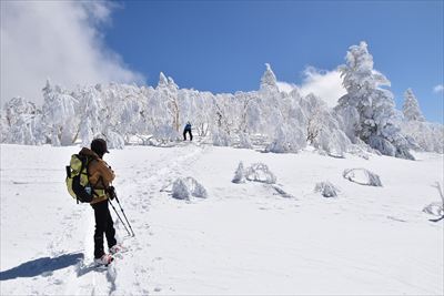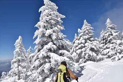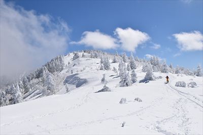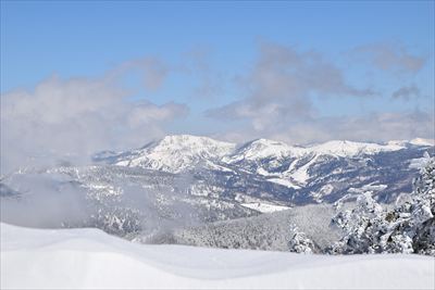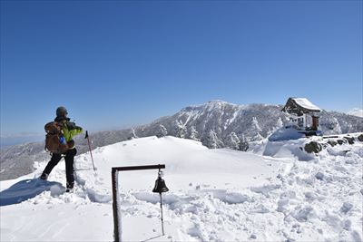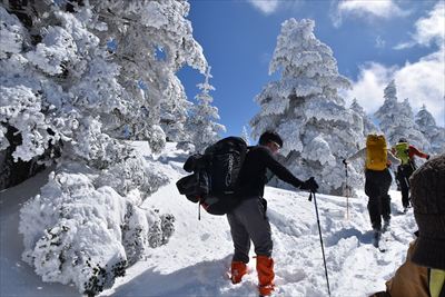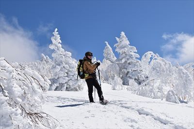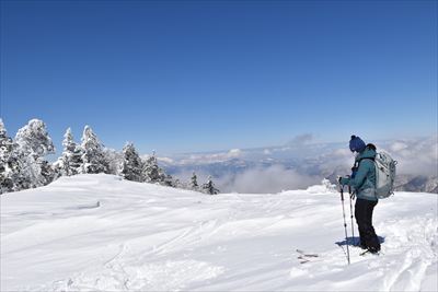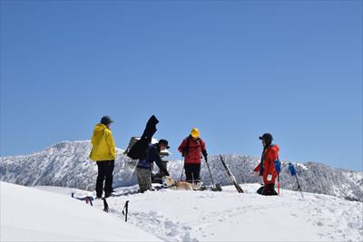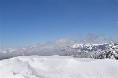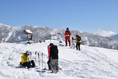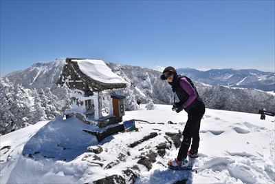 | 山頂でランチ スノーシューでの登山は少数、BCの方がほとんどなので山頂は空いてます BCの方はすい〜っと滑り降りていくからね スノーシュー脱いだら膝までズボっと...今日はスノーシュー必須ですね |