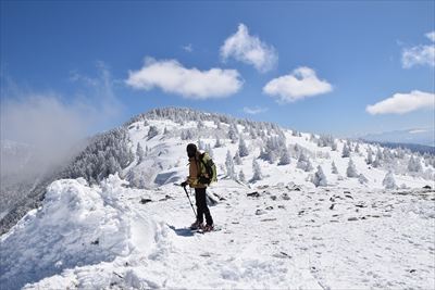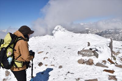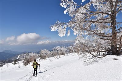| 下りは楽なんだけど奥さんから少しずつ離れていきます... 霧氷は溶けてきたし、雲が増えてアルプスは隠れ気味、もくもくと歩く |