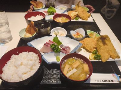 | ネットで調べたお店でランチ、とここはE-Gunmaさん&クリスカさんがこの間来てたお店だね 「出雲崎定食」を頼みました、お刺身もフライも美味しかった♪(夕食食べられるかぁ〜) 雪国植物園で予想以上に楽しんだので混む時間になってしまい、海の見える席ではなかったけど |
