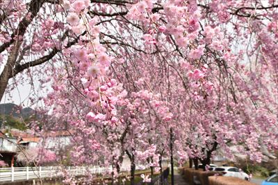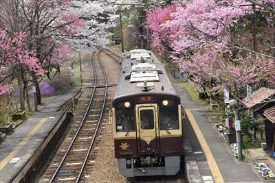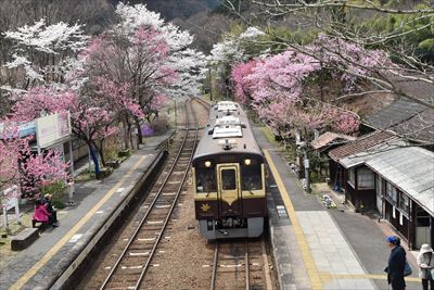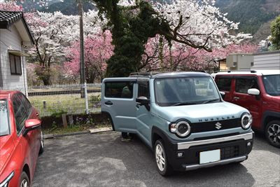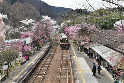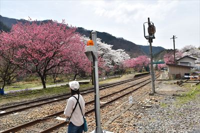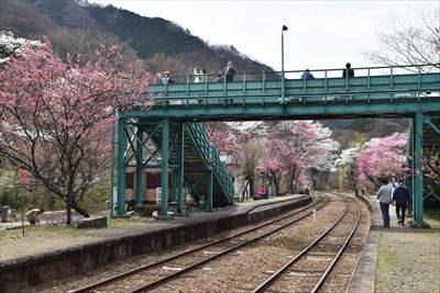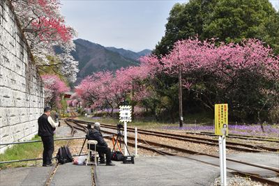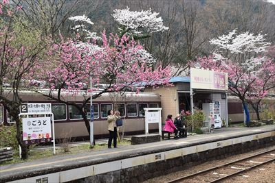 | 大人気の神戸駅へ移動、何とか駐車できました、大型観光バスが4、5台! 花桃がちょうど見頃です |