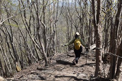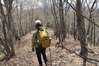 | 男性が登ってきました、サコッシュの持ち主の様です、ほっとしました いつもだったら下の方は新緑でミツバツツジが咲いてるのに 今年はアカヤシオが一気に咲いたのでまだのようです |