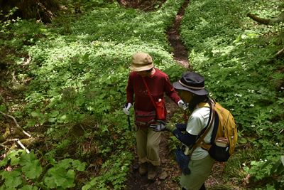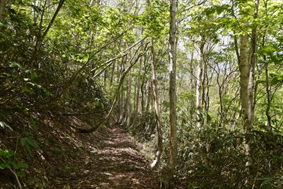 | K2隊とお別れしてうちは「シナの木コース」遊歩道へ この時期はハイキングより山菜採りの方が多いのかも 焼額山麓は熊注意!! |