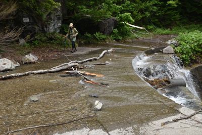 | 「ぶなのしずく」もだけど、折れた木が多い 今回は往復でしたが、新道にはサルメンエビネも咲くそうです (後日のレポ:マチガ沢と一ノ倉沢の間でサルメンエビネが咲いてたようです) 一ノ倉沢に戻ったら大勢の中学生!!(自然教室らしい、川口市の宿泊施設があるんだね) |