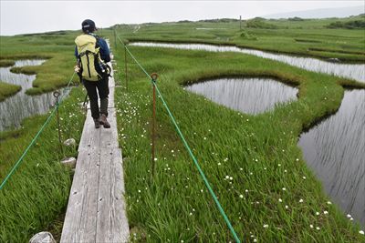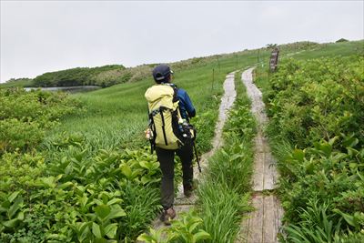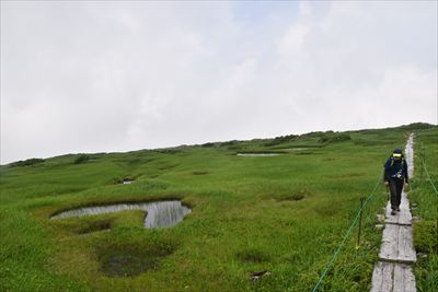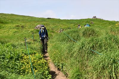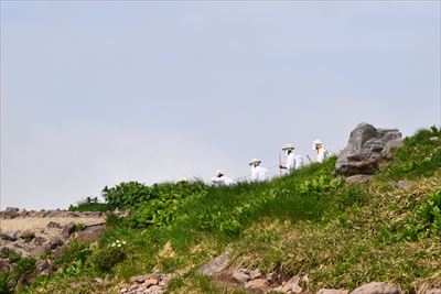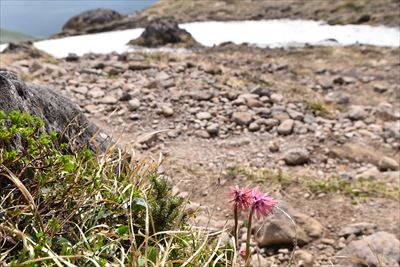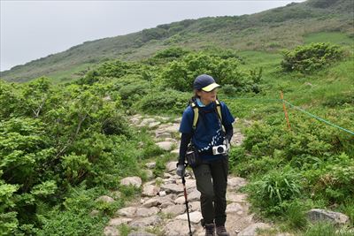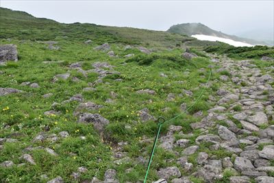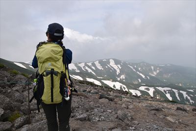 雪渓は下り注意!奥さんはチェーンアイゼン装着