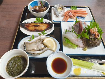 | ウエルカムドリンクならぬさくらんぼ | ・生牡蠣 ・刺身はサザエ、アジ、キジハタ ・焼き物はカラスガレイ ・バイ貝 ・モズク ・ズワイガニが脇役 プラス「はえぬき」ごはんと「あおさ」の味噌汁 |