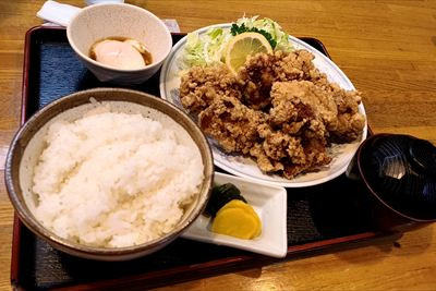 | 夕食は「食堂 大河原」、人気のお店だったらしい ⇒食べログ 奥さんの唐揚げ定食を個数の多い唐揚げ単品の定食にして、僕が半分食べた 特にお客が多かったらしくまだ18時半なのに唐揚げ売り切れ、ご飯切れになってた |