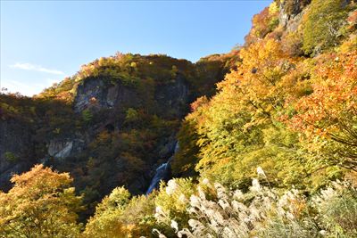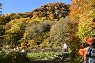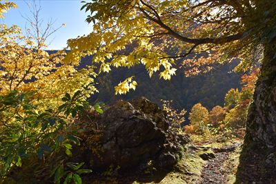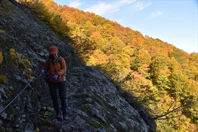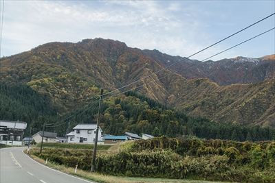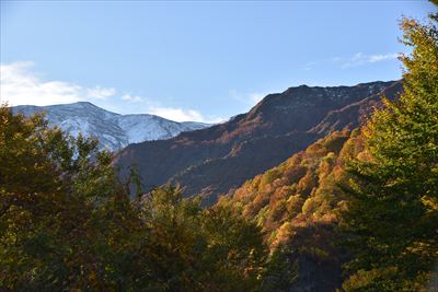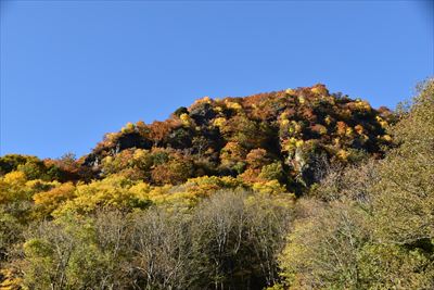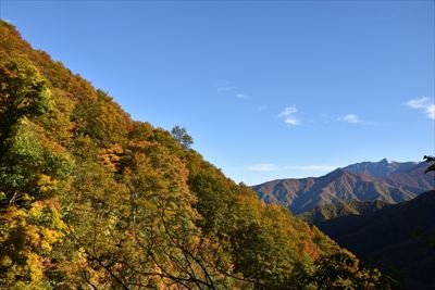| 雪が残っている巻機山が見える、3段紅葉は見られないと思うけど 初っ端から青空にきれいな紅葉♪ 今日来てよかった |