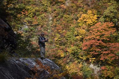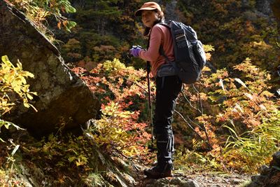 対岸の紅葉がきれいなので、奥さんにモデルしてもらった