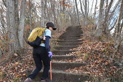 | 那須塩原の男性はここでランチしたそう 国道の方に行きかけたら、月居山はここ登るんだよ、と教えてくれた げっ!きつい登り、階段が待ってました...やっぱりアップダウンあるし |