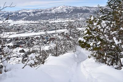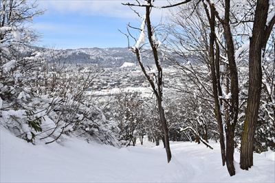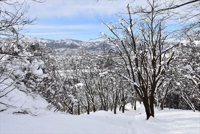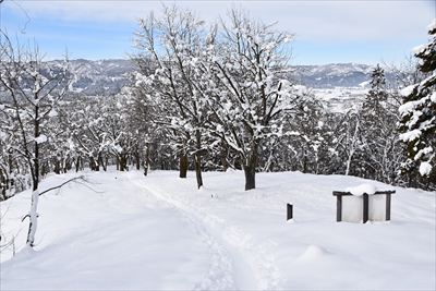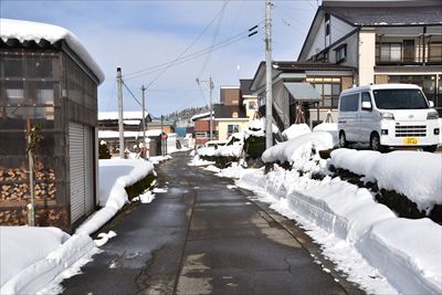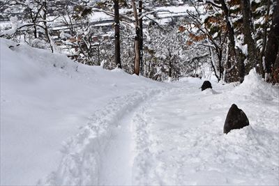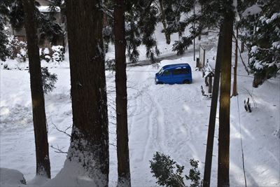| 神社の駐車場、1台駐車してるけど大丈夫かぁ? 銭渕公園までアイゼンなしで歩きます、奥さんは山頂に戻った頃かな |