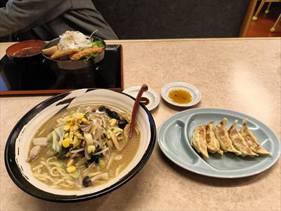 | 本気丼をやっているお店は水曜日だし16時頃だし少ない 前にも入ったことのある「どさん娘」で奥さんは本気丼、僕は普通に「特選みそラーメン&にんにく餃子」 |