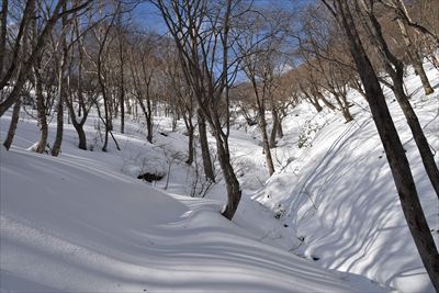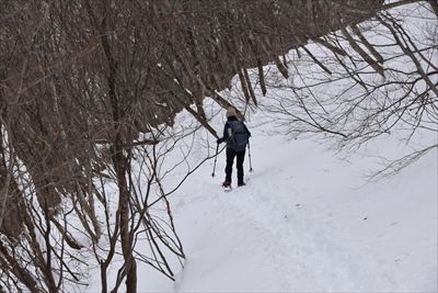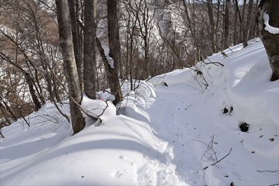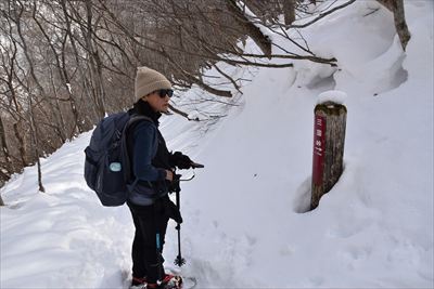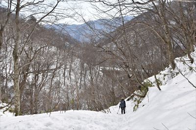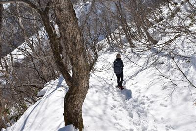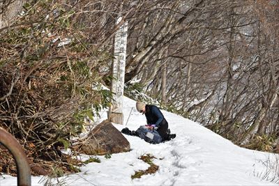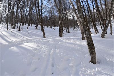 | と、三国峠から先が大変だった! ブッシュ(藪)の木に引っかかったり、緩んだ雪に難儀したり... 追い抜いていった男性はパワーで下りて行った!ツボ足? |