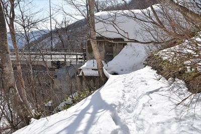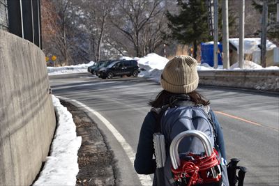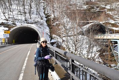 | 今日もワカンの方がよかった...かもしれない スノーシューを脱いで旧トンネルから新トンネルの入口付近の歩行者出口?から車道へ 後は車に気を付けながら駐車場に戻ります |