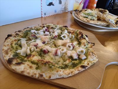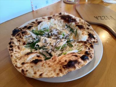 | 奥さんチョイスは1月限定『ネギとしらすのピザ』 | バジルシーフード(僕チョイス) |