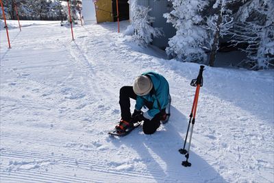| 第1ペアリフト降り場の横に記念撮影パネルがあります ここは晴れて青空だけど他は雲が多いようです 富士山、アルプス、よくわかりません 奥さん、最近ワカンばかりだったので今季初スノーシュー 装着に手間取ってました |