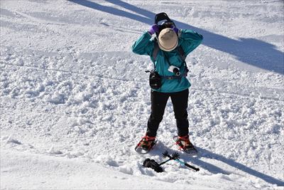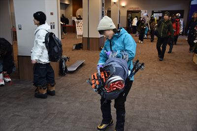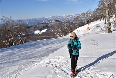 | 第1、第2とリフトを乗り継ぎゲレンデトップ 直登は大変なので左の緩めの所からスタートします 僕はスノーシュー、奥さんはワカンでスノーシューは担ぎ(結局最後までそのまま) |